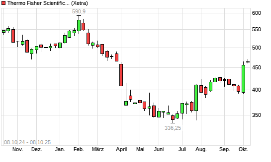 Mit dem Anstieg auf 466,00 EUR hat die Thermo Fisher-Aktie (ISIN US8835561023) am 07.10.2025 ein neues 6-Monats-Hoch erreicht und damit den Kurs vom 06.10.2025 eingestellt.