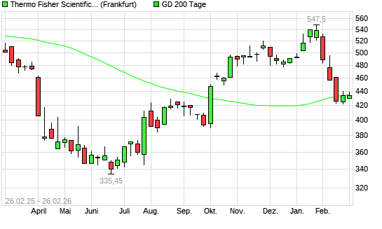 Mit dem Anstieg auf 439,10 EUR hat die Thermo Fisher-Aktie am 25.02.2026 die 200-Tage-Linie nach oben gekreuzt.