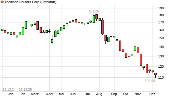 Mit dem Rücksetzer auf 109,95 EUR hat die Thomson Reuters Corp.-Aktie (ISIN CA8849038085) am 11.12.2025 ein neues 12-Monats-Tief erreicht und damit den Kurs vom 10.12.2025 eingestellt.