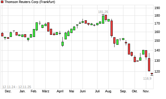 Mit dem Rücksetzer auf 116,90 EUR hat die Thomson Reuters Corp.-Aktie (ISIN CA8849038085) am 11.11.2025 ein neues 12-Monats-Tief erreicht und damit den Kurs vom 10.11.2025 eingestellt.Die ...weiterlesen