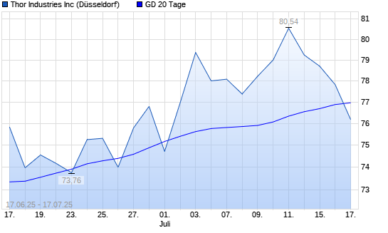 Mit dem Rücksetzer auf 76,24 EUR hat die Thor Industries-Aktie am 16.07.2025 die 20-Tage-Linie nach unten gekreuzt.