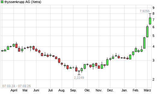 Mit dem Anstieg auf 9,72 EUR hat die ThyssenKrupp-Aktie (ISIN DE0007500001) am 06.03.2025 ein neues 3-Jahres-Hoch erreicht und damit den Kurs vom 16.03.2022 eingestellt.