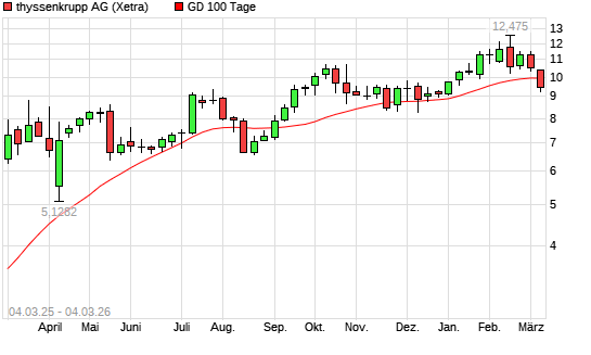 Mit dem Rücksetzer auf 9,65 EUR hat die ThyssenKrupp-Aktie am 03.03.2026 die 100-Tage-Linie nach unten gekreuzt.
