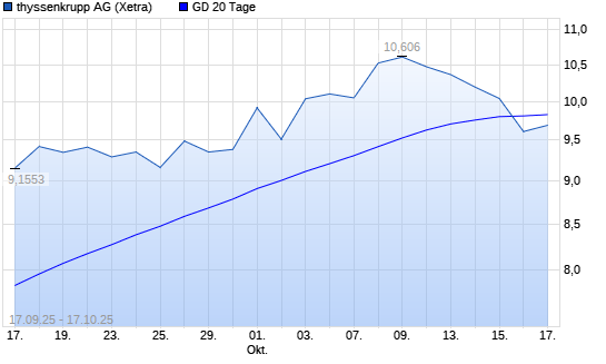 Mit dem Rücksetzer auf 12,02 EUR hat die ThyssenKrupp-Aktie am 16.10.2025 die 20-Tage-Linie nach unten gekreuzt.