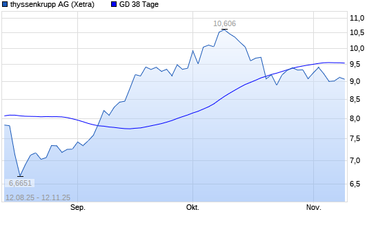 Mit dem Rücksetzer auf 9,04 EUR hat die ThyssenKrupp-Aktie am 11.11.2025 die 38-Tage-Linie nach unten gekreuzt.