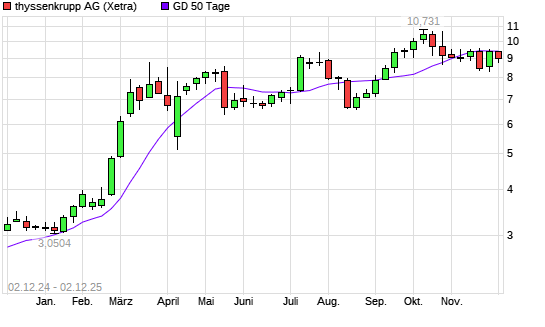 Mit dem Rücksetzer auf 9,00 EUR hat die ThyssenKrupp-Aktie am 01.12.2025 die 50-Tage-Linie nach unten gekreuzt.