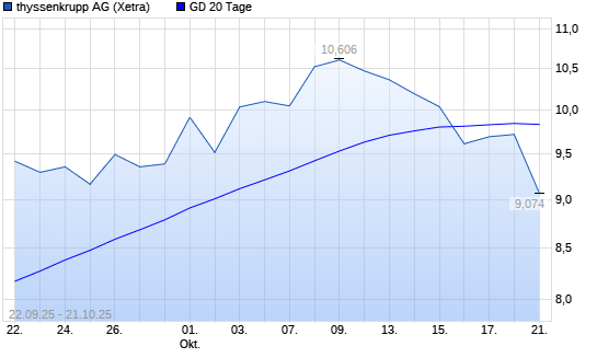 Mit dem Anstieg auf 9,66 EUR hat die ThyssenKrupp-Aktie am 20.10.2025 die 20-Tage-Linie nach oben gekreuzt.Die ThyssenKrupp-Aktie befindet sich seit dem 14.01.2025 im langfristigen Aufwärtstrend ...weiterlesen