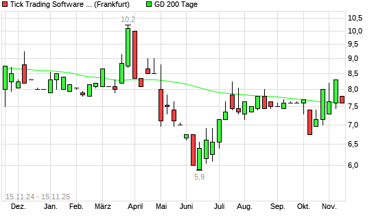 Mit dem Rücksetzer auf 7,60 EUR hat die Tick Trading Software-Aktie am 14.11.2025 die 200-Tage-Linie nach unten gekreuzt.