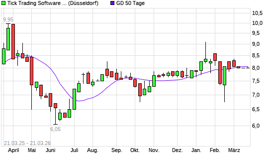 Mit dem Rücksetzer auf 7,95 EUR hat die Tick Trading Software-Aktie am 20.03.2026 die 50-Tage-Linie nach unten gekreuzt.