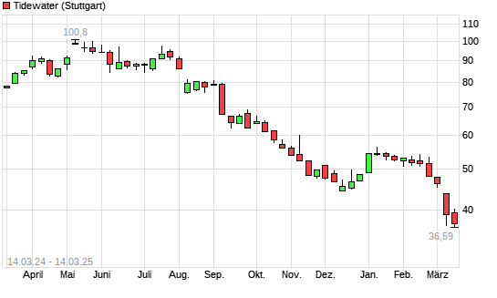 Mit dem Rücksetzer auf 36,68 EUR hat die Tidewater-Aktie (ISIN US88642R1095) am 13.03.2025 ein neues 12-Monats-Tief erreicht und damit den Kurs vom 12.03.2025 eingestellt.