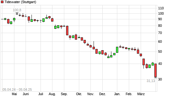 Mit dem Rücksetzer auf 31,54 EUR hat die Tidewater-Aktie (ISIN US88642R1095) am 04.04.2025 ein neues 12-Monats-Tief erreicht und damit den Kurs vom 03.04.2025 eingestellt.