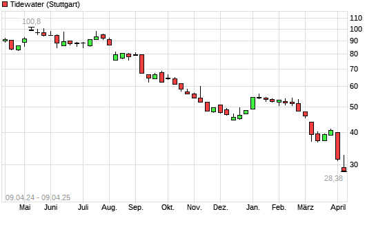 Mit dem Rücksetzer auf 29,47 EUR hat die Tidewater-Aktie (ISIN US88642R1095) am 08.04.2025 ein neues 12-Monats-Tief erreicht und damit den Kurs vom 04.04.2025 eingestellt.