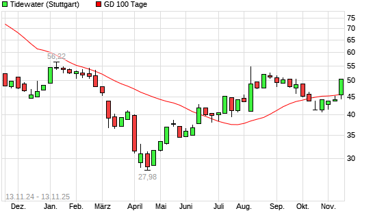 Mit dem Anstieg auf 47,26 EUR hat die Tidewater-Aktie am 12.11.2025 die 100-Tage-Linie nach oben gekreuzt.