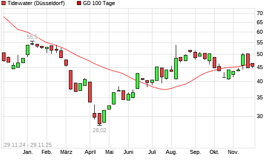 Mit dem Anstieg auf 46,43 EUR hat die Tidewater-Aktie am 28.11.2025 die 100-Tage-Linie nach oben gekreuzt.