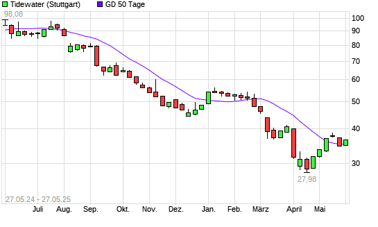 Mit dem Rücksetzer auf 34,23 EUR hat die Tidewater-Aktie am 26.05.2025 die 50-Tage-Linie nach unten gekreuzt.