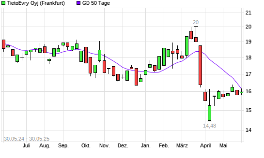 Mit dem Anstieg auf 16,00 EUR hat die Tietoevry-Aktie am 29.05.2025 die 50-Tage-Linie nach oben gekreuzt.
