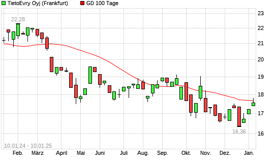 Mit dem Rücksetzer auf 17,57 EUR hat die Tietoevry-Aktie am 09.01.2025 die 100-Tage-Linie nach unten gekreuzt.