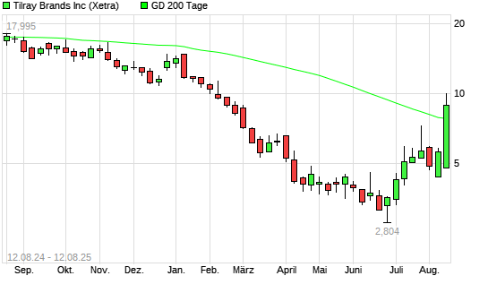 Mit dem Anstieg auf 0,78 EUR hat die Tilray-Aktie am 11.08.2025 die 200-Tage-Linie nach oben gekreuzt.