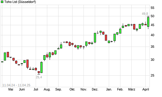 Mit dem Anstieg auf 49,80 EUR hat die Toho-Aktie (ISIN JP3598600009) am 10.04.2025 ein neues All-Time-High erreicht und damit den Kurs vom 04.04.2025 eingestellt.