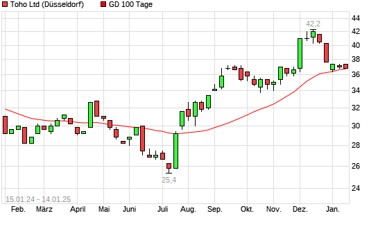 Mit dem Anstieg auf 37,60 EUR hat die Toho-Aktie am 13.01.2025 die 100-Tage-Linie nach oben gekreuzt.