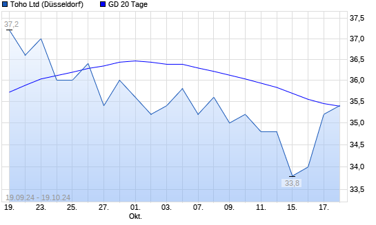Mit dem Anstieg auf 35,60 EUR hat die Toho-Aktie am 18.10.2024 die 20-Tage-Linie nach oben gekreuzt.