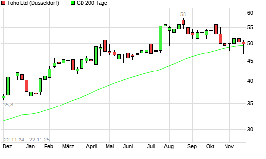 Mit dem Anstieg auf 50,00 EUR hat die Toho-Aktie am 21.11.2025 die 200-Tage-Linie nach oben gekreuzt.