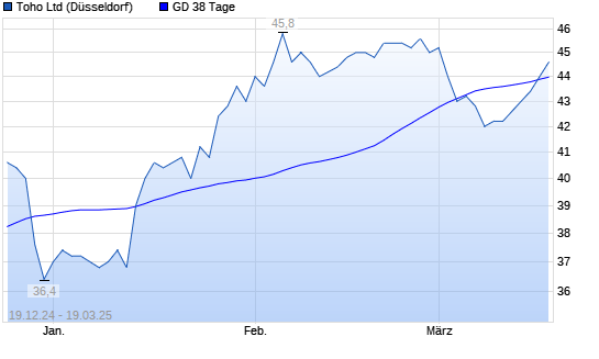 Mit dem Anstieg auf 44,20 EUR hat die Toho-Aktie am 18.03.2025 die 38-Tage-Linie nach oben gekreuzt.