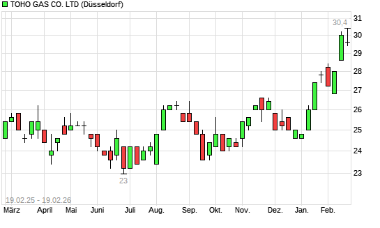 Mit dem Anstieg auf 30,60 EUR hat die Toho Gas Co. Ltd-Aktie (ISIN JP3600200004) am 18.02.2026 ein neues 3-Jahres-Hoch erreicht und damit den Kurs vom 12.02.2026 eingestellt.