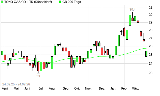 Mit dem Rücksetzer auf 25,00 EUR hat die Toho Gas Co. Ltd-Aktie am 23.03.2026 die 200-Tage-Linie nach unten gekreuzt.