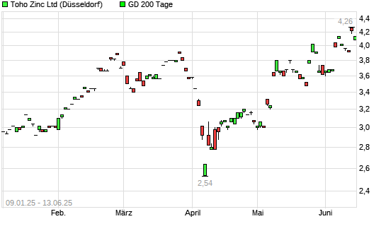 Mit dem Anstieg auf 4,28 EUR hat die Toho Zinc-Aktie am 12.06.2025 die 200-Tage-Linie nach oben gekreuzt.