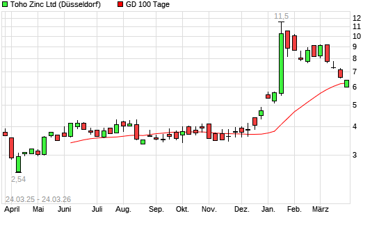 Mit dem Rücksetzer auf 6,10 EUR hat die Toho Zinc-Aktie am 23.03.2026 die 100-Tage-Linie nach unten gekreuzt.
