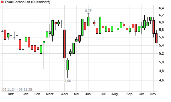Mit dem Rücksetzer auf 5,50 EUR hat die Tokai Carbon-Aktie (ISIN JP3560800009) am 07.11.2025 ein neues 6-Monats-Tief erreicht und damit den Kurs vom 08.05.2025 eingestellt.