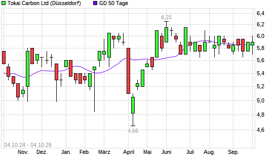 Mit dem Anstieg auf 5,90 EUR hat die Tokai Carbon-Aktie am 03.10.2025 die 50-Tage-Linie nach oben gekreuzt.