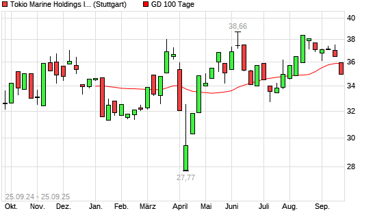 Mit dem Rücksetzer auf 34,69 EUR hat die Tokio Marine Holdings-Aktie am 24.09.2025 die 100-Tage-Linie nach unten gekreuzt.