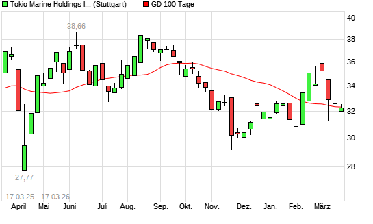 Mit dem Rücksetzer auf 31,85 EUR hat die Tokio Marine Holdings-Aktie am 16.03.2026 die 100-Tage-Linie nach unten gekreuzt.