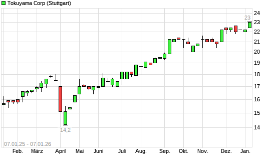 Mit dem Anstieg auf 22,80 EUR hat die Tokuyama-Aktie (ISIN JP3625000009) am 06.01.2026 ein neues 5-Jahres-Hoch erreicht und damit den Kurs vom 26.11.2025 eingestellt.