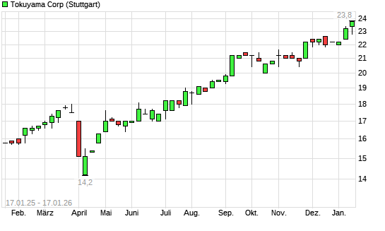 Mit dem Anstieg auf 23,60 EUR hat die Tokuyama-Aktie (ISIN JP3625000009) am 16.01.2026 ein neues 5-Jahres-Hoch erreicht und damit den Kurs vom 15.01.2026 eingestellt.