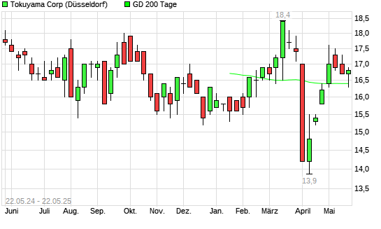 Mit dem Anstieg auf 16,90 EUR hat die Tokuyama-Aktie am 21.05.2025 die 200-Tage-Linie nach oben gekreuzt.
