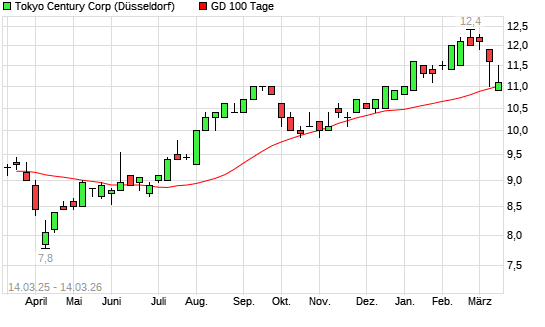 Mit dem Rücksetzer auf 11,10 EUR hat die Tokyo Century Corp-Aktie am 13.03.2026 die 100-Tage-Linie nach unten gekreuzt.