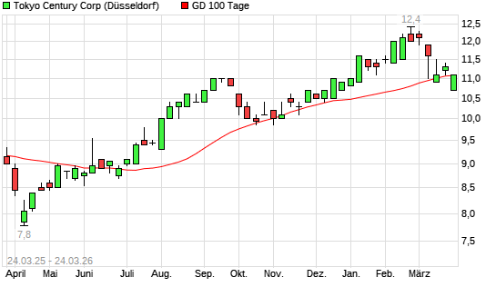 Mit dem Rücksetzer auf 11,20 EUR hat die Tokyo Century Corp-Aktie am 23.03.2026 die 100-Tage-Linie nach unten gekreuzt.