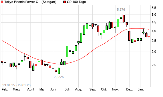 Mit dem Rücksetzer auf 3,64 EUR hat die Tokyo Electric Power-Aktie am 22.01.2026 die 100-Tage-Linie nach unten gekreuzt.Die Tokyo Electric Power-Aktie befindet sich seit dem 18.12.2025 ...weiterlesen