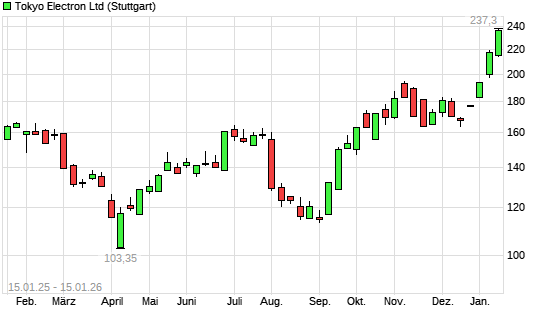 Mit dem Anstieg auf 226,60 EUR hat die Tokyo Electron-Aktie (ISIN JP3571400005) am 14.01.2026 ein neues 12-Monats-Hoch erreicht und damit den Kurs vom 13.01.2026 eingestellt.