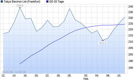 Mit dem Anstieg auf 225,50 EUR hat die Tokyo Electron-Aktie am 10.02.2026 die 20-Tage-Linie nach oben gekreuzt.