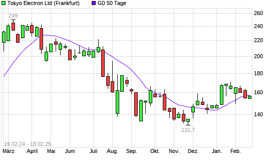 Mit dem Anstieg auf 157,10 EUR hat die Tokyo Electron-Aktie am 17.02.2025 die 50-Tage-Linie nach oben gekreuzt.