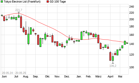 Mit dem Rücksetzer auf 142,15 EUR hat die Tokyo Electron-Aktie am 19.05.2025 die 100-Tage-Linie nach unten gekreuzt.