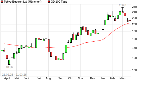 Mit dem Rücksetzer auf 199,30 EUR hat die Tokyo Electron-Aktie am 20.03.2026 die 100-Tage-Linie nach unten gekreuzt.