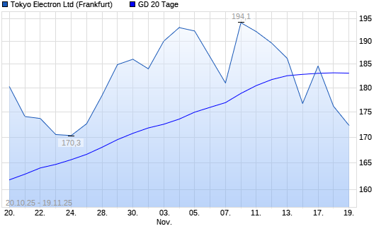 Mit dem Rücksetzer auf 176,20 EUR hat die Tokyo Electron-Aktie am 18.11.2025 die 20-Tage-Linie nach unten gekreuzt.