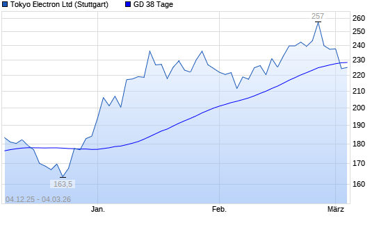 Mit dem Rücksetzer auf 225,00 EUR hat die Tokyo Electron-Aktie am 03.03.2026 die 38-Tage-Linie nach unten gekreuzt.Die Tokyo Electron-Aktie befindet sich seit dem 18.09.2025 ...weiterlesen