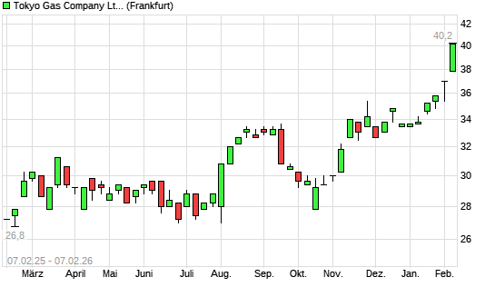 Mit dem Anstieg auf 40,20 EUR hat die Tokyo Gas-Aktie (ISIN JP3573000001) am 06.02.2026 ein neues All-Time-High erreicht und damit den Kurs vom 04.02.2026 eingestellt.