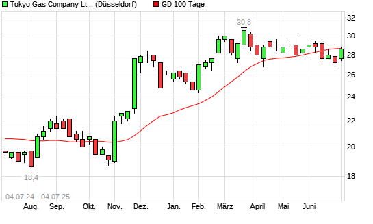 Mit dem Rücksetzer auf 28,80 EUR hat die Tokyo Gas-Aktie am 03.07.2025 die 100-Tage-Linie nach unten gekreuzt.